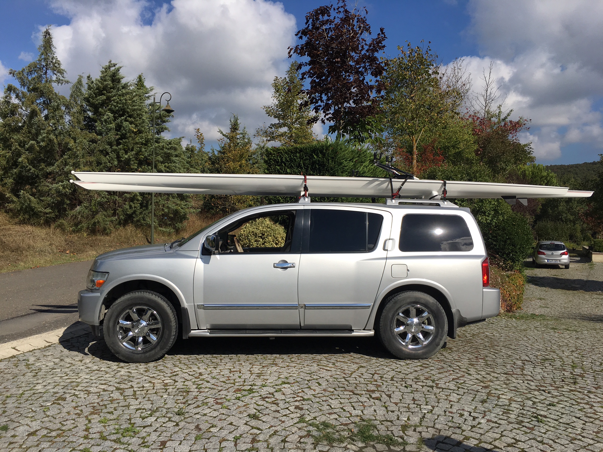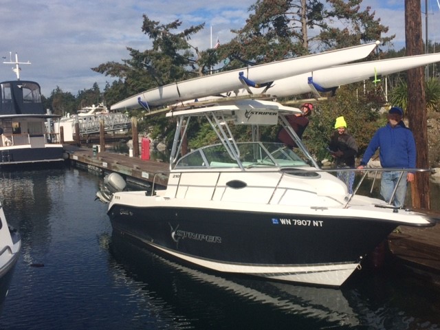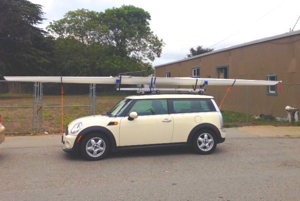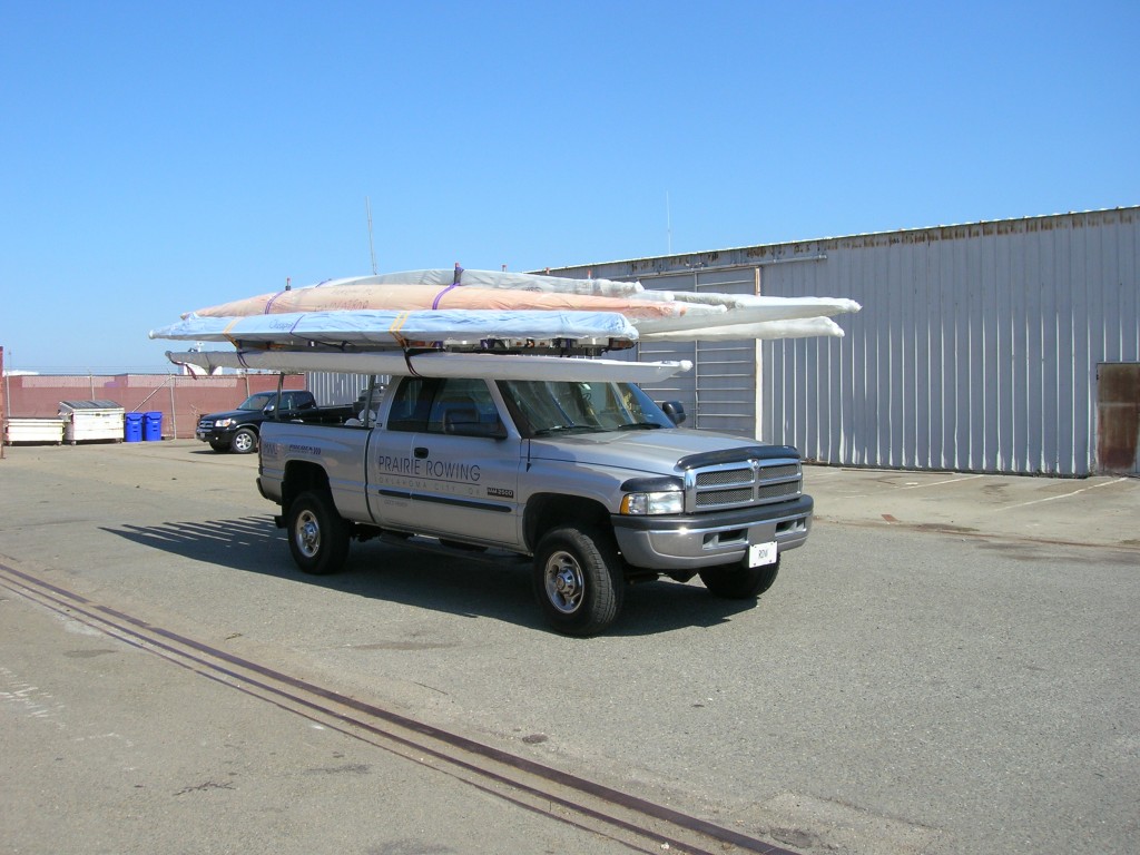 To carry your shell on top of your car, you will need good modern racks, because of the boat’s length. Remember your investment, and don’t scrimp on cheap racks designed to carry surfboards that are a third the length and a fraction of the weight. Yakima and Thule make excellent rack systems, with saddles that fit the shape of these shells. They even have units that attach to aerodynamically shaped (no rain gutters) cars. Burnham Boat Slings, Hudson and others make car top carriers designed specifically for rowing shells
